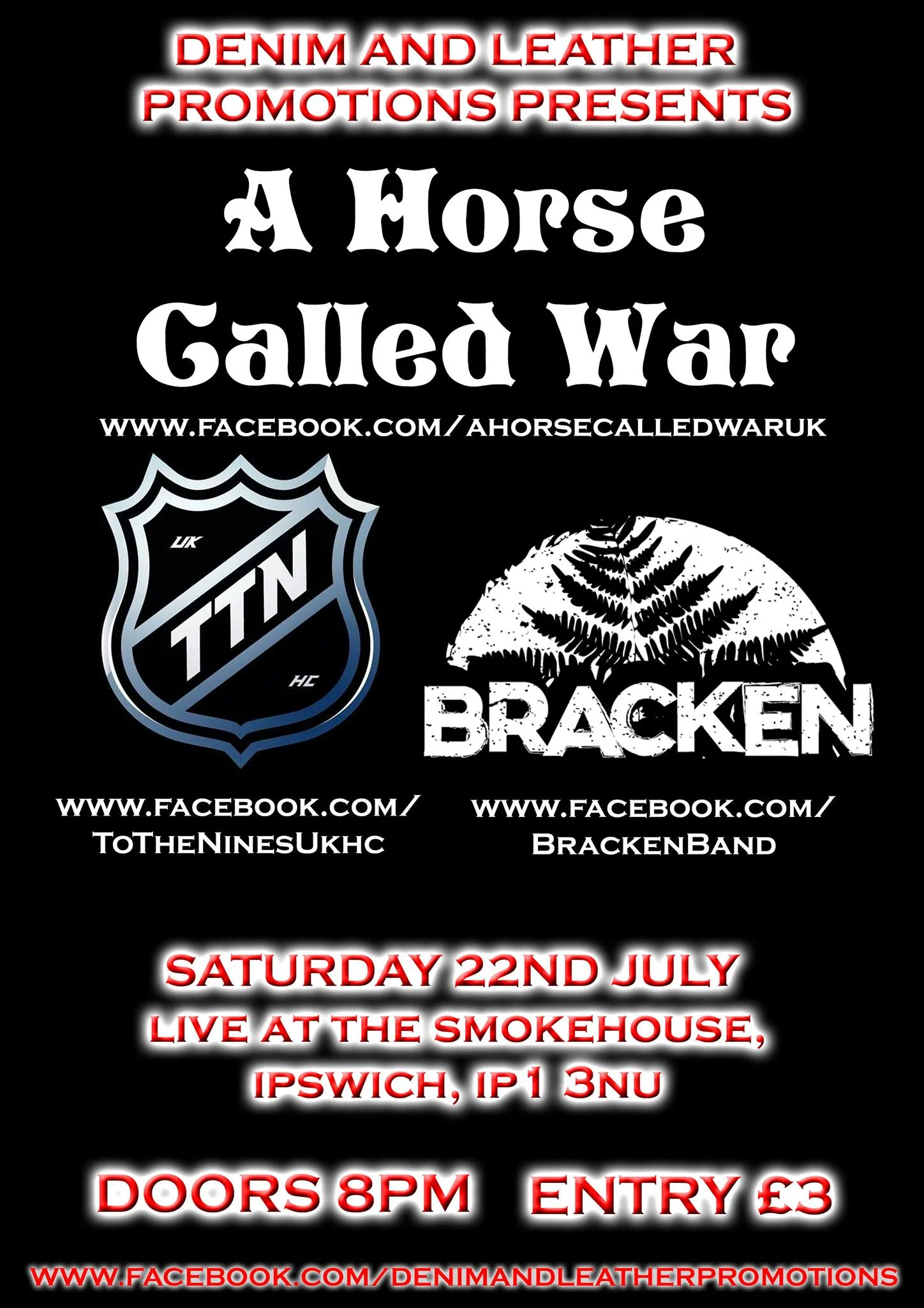 It's time to get a little sludgy and a bit hardcore as Denim And Leather Promotions presents another night of heaviness down at The Smokehouse, Ipswich featuring A Horse Called War, To The Nines - UKHCand Bracken!