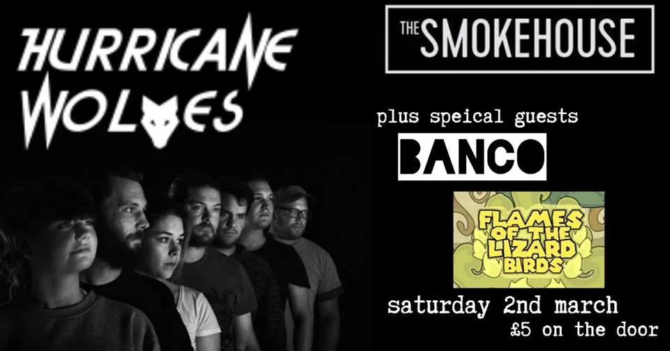 Hurricane Wolves / Banco / Flames Of The Lizard Birds Saturday 2 March 2019 8:00 pm 11:00 pm 20:00 23:00 The Smokehouse 6 South Street Ipswich, England, IP1 3NU United Kingdom (map) Google Calendar ICS Hurricane wolves BancoFlames of the lizard birdsPlaying live at The Smokehouse Saturday 2nd March £5 on the door