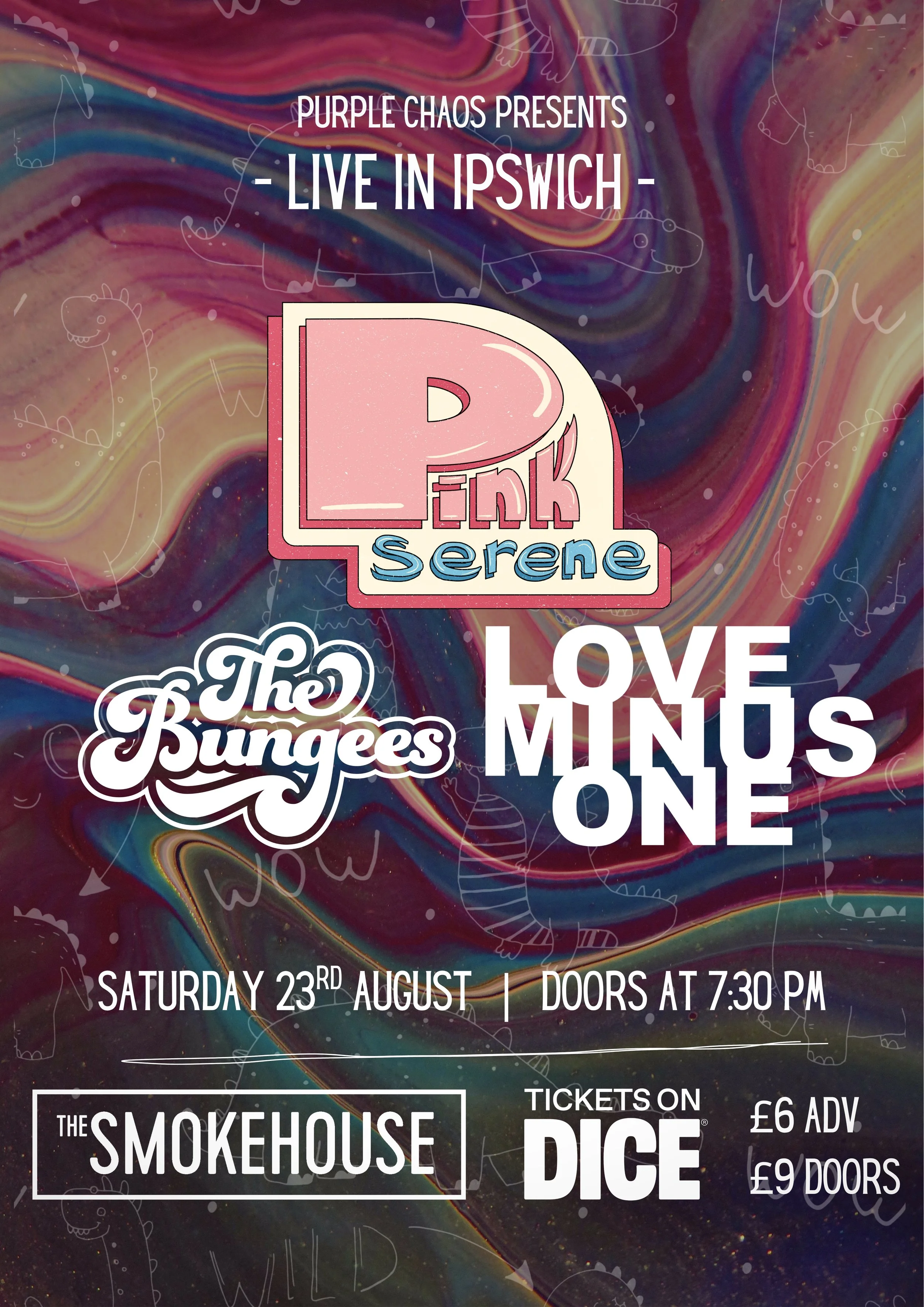 An energetic night of 3 emerging alt-rock/indie-rock bands presented by Purple Chaos Live with Pink Serene, Love Minus One, and The Bungees.